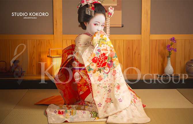 舞妓さんはお着物の内側の衿が赤色と白色の2色からお選びいただけます!